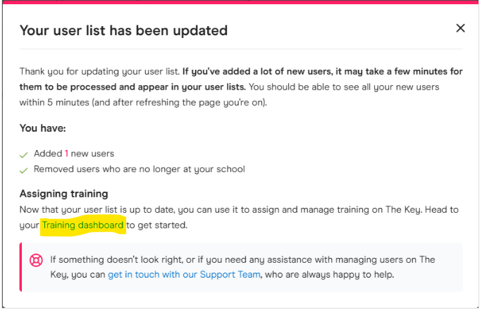 Your list will be updated and you will see an on screen confirmation of this, please click on 'Training dashboard' (highlighted below) to start allocating the training courses to your colleagues.