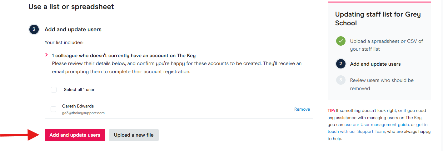 - Once you have uploaded your file successfully, it will show on screen, including the colleagues details that you have uploaded. You have the ability to add and update users at this time as well.